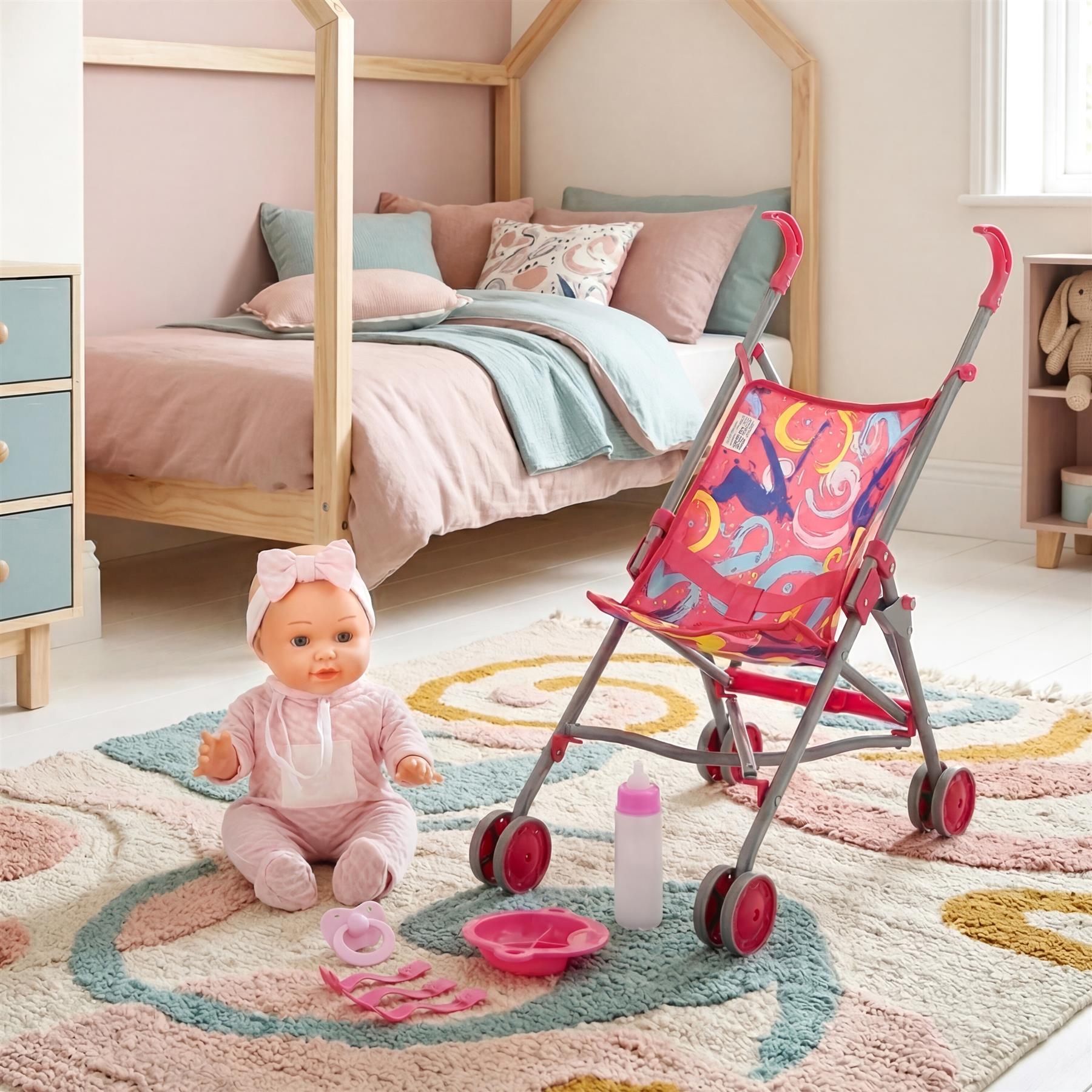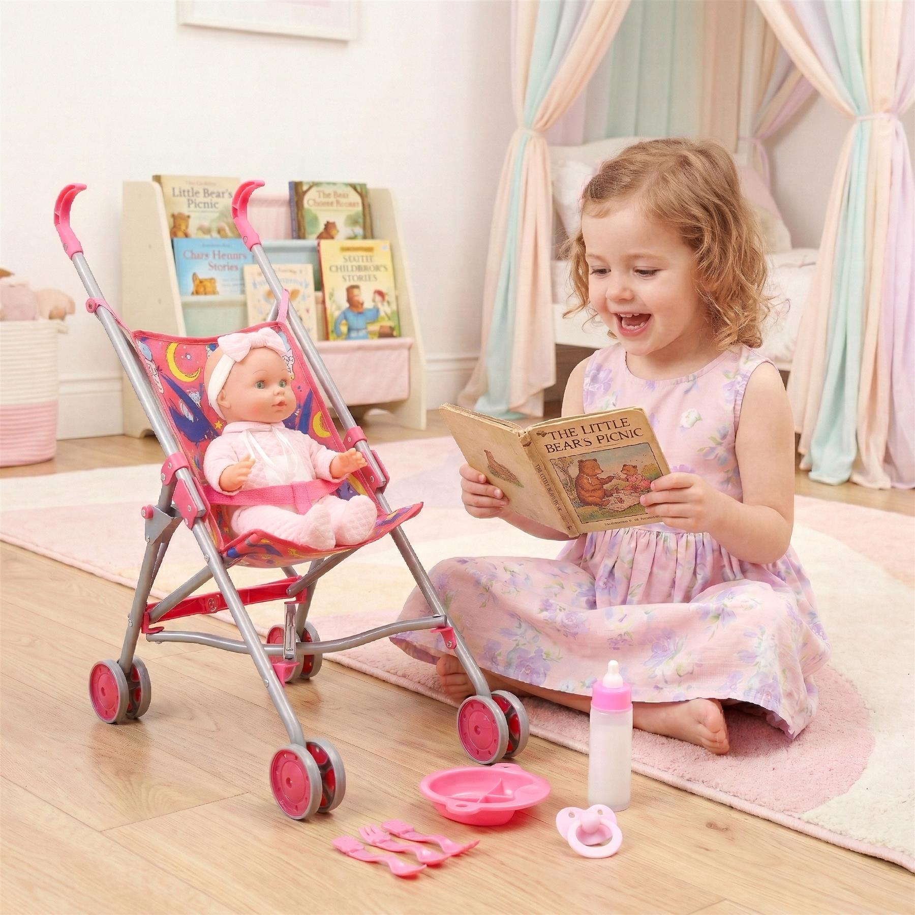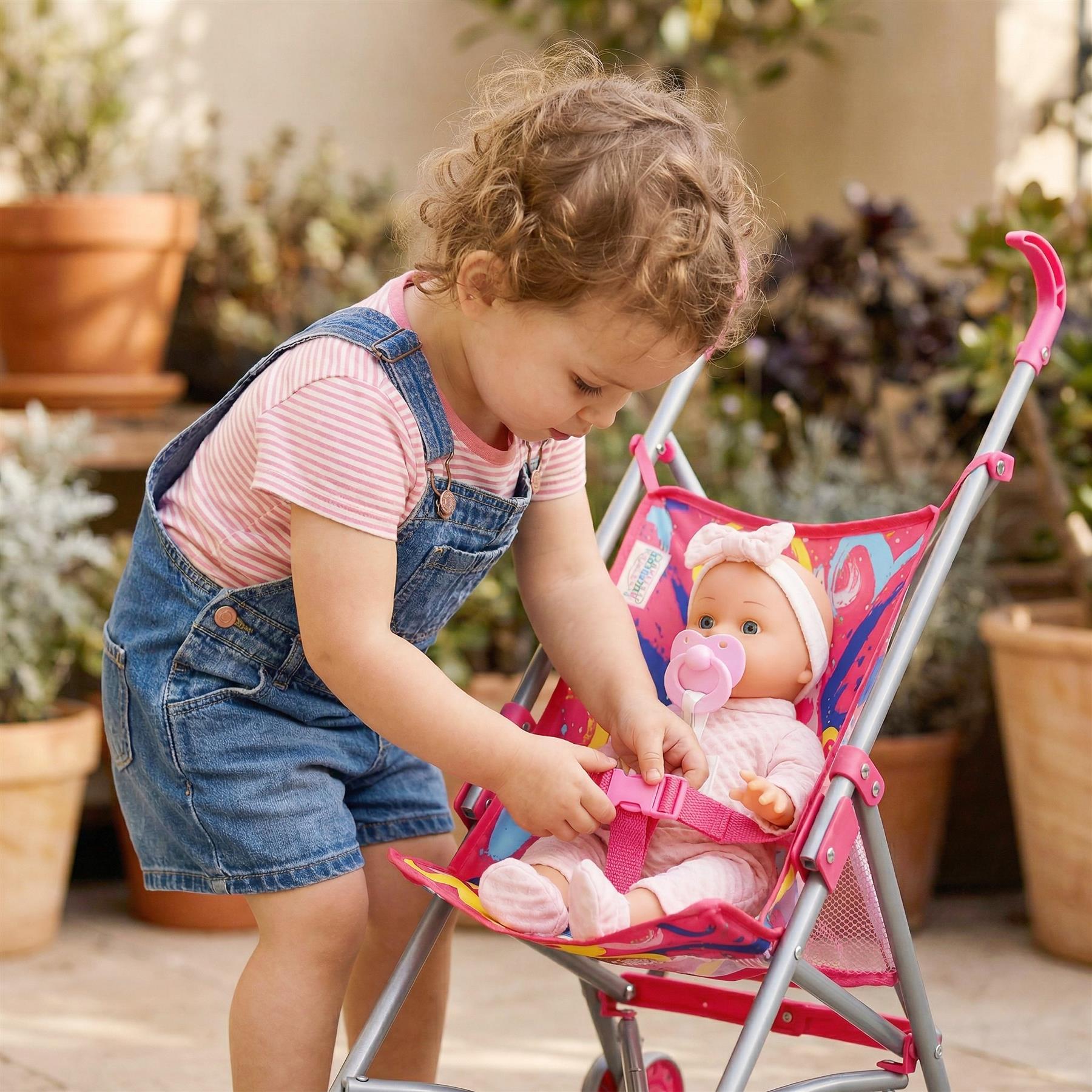 Lovely doll buggy, bring your BiBi Dolls with you for all kinds of adventures. Now with doll and selection of feeding accessories included!